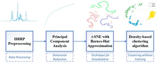 The overall structure of our proposed method is shown in Figure 1. Firstly, we employ the absolute value of the HRRP amplitude for further dimension reduction and recognition. Secondly, we utilize principle component analysis to reduce the dimension of HRRP data, which can subtract data redundancy and reduce processing time. Visualization of high dimensional data provides people with an intuitive understanding and it also compresses HRRPs effectively. Thirdly, we adopt the algorithm of t-SNE with Barnes–Hut approximation, which is much faster than the conventional t-SNE. Finally, most classification algorithms in radar automatic target recognition need to obtain target labels in advance, while the attribute information of targets cannot be acquired under some specific conditions. Therefore, a predominant clustering algorithm is demanded, and we take advantage of a novel density-based clustering algorithm to accomplish accurate classification of man-made objects without training.