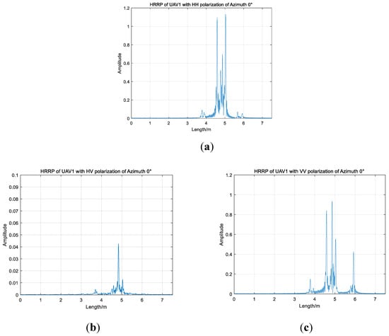 HRRPs of UAV1 with full polarization of azimuth 0° are presented in Figure 3. HH, HV and VV are three polarization channels. The average amplitudes of HH and VV channels are much larger than that of the HV channel. However, the amplitude distributions of UAV HRRPs with HH and VV polarization are roughly similar. Strong scattering points are concentrated in the range from 3.5 to 6 m. Between 4.4 m and 5.2 m, the energy of the one-dimensional range image is obviously concentrated, and more than three peaks appear with HH and VV polarization. When the azimuth angle is 0°, the positions and numbers of strong scatters are approximately identical to co-polarized channels. However, comparing HH and VV channels, the relative magnitudes of the same channel are different according to Figure 3a,c. With high-resolution range profiles of three channels, we are able to estimate the approximate size information roughly.