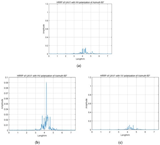 As shown in Figure 5, HRRPs of UAV1 of three polarization channels of azimuth 60° are different from Figure 3. It is apparent that amplitudes of range profiles are smaller than those of the azimuth angle of 0 degrees in HH and VV polarization channels. The maximum amplitudes of the co-polarized HRRPs are both less than 0.2 and there is no range cell with a particularly high amplitude value. There is a significant difference between the amplitudes of HRRPs in HV polarization channel with azimuth angles of 0° and 60°, and the average amplitude of azimuth 0 degrees is higher than that of 60°, which is different from those of HH and VV polarization channel. Therefore, it is necessary for us to analyze the mean amplitude at different azimuth angles.