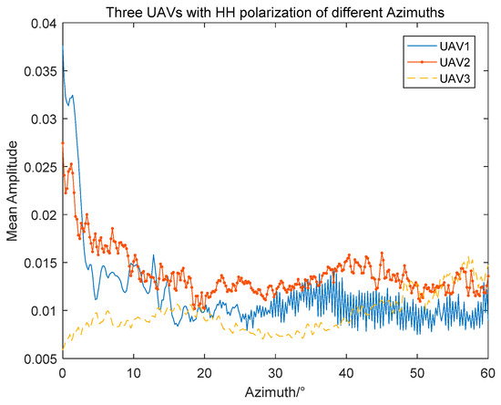 As shown in Figure 6, the fluctuation for UAV1 and UAV2 in mean amplitudes is approximately consistent from azimuth 0 to 60 degrees, because they are identical in structure and size. The mean amplitudes of UAV3 are mostly inferior to the other two UAVs in the azimuth angle range from 0 to 40°. When the azimuth angle scope is between 30° and 60°, the mean amplitude of UAV3 shows an uptick in volatility. In the same azimuth angle range, the amplitude changes of UAV 1 and UAV 2 are approximately the same, and the mean amplitude of UAV1 is greater than UAV2 in most cases due to the differences of shape and material properties. It is difficult to identify different UAVs with the average amplitude. Therefore, the amplitude information of HRRPs should be deeply studied.