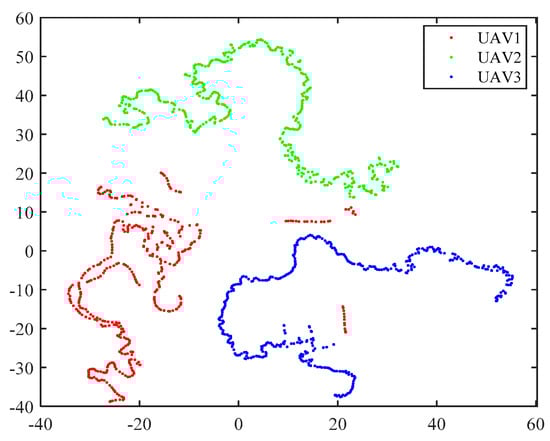 Visualization of three UAVs by t-distributed stochastic neighbor embedding (t-SNE) technique (with Barnes–Hut algorithm) in 2D coordinate system.