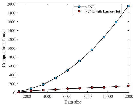 Computation time between conventional t-SNE and accelerated t-SNE with Barnes–Hut algorithm with different data sizes.