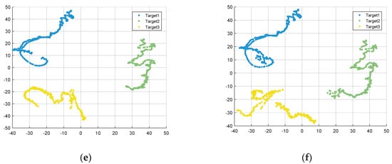 Clustering results of three UAVs with the signal-to-noise ratio (SNR) of 40dB with different azimuth angle ranges. (a) Azimuth angle range of 10°; (b) azimuth angle range of 20°; (c) azimuth angle range of 30°; (d) azimuth angle range of 40°; (e) azimuth angle range of 50°; (f) azimuth angle range of 60°.