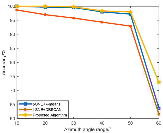 As shown in Figure 11, when the SNR is 5 dB, the classification results of different algorithms are worse than that of 40 dB. The effects of noise and azimuth range on the algorithm are also clearer. With the increase of azimuth angle range, the accuracy of classification of the three algorithms decreases. The clustering accuracy of our proposed algorithm is superior to two conventional methods, which include k-means and DBSCAN with different azimuth angle ranges. Since the clustering algorithm cannot obtain any label information of the targets, it is easy to generate confusion under the condition of large azimuth angle range and low SNR. Under the condition that the azimuth angle range is 60° and the SNR is 5 dB, the accuracy of classification with conventional algorithms are both inferior to 64%. However, the algorithm that we have proposed in this paper can achieve an accuracy of nearly 73%, and it still maintains a high accuracy under low SNR and large azimuth angle range, which fully demonstrates superiority and reliability of the proposed algorithm.