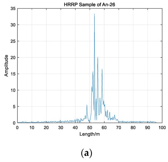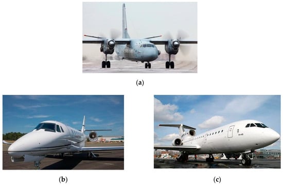 In order to further verify the reliability of the proposed algorithm, we utilized the real-measured HRRPs from three different kinds of flying planes, which contain the An-26, the Cessna Citation, and the Yark-42. The models of three planes are shown in Figure 12, where Figure 12a–c represents the An-26, the Cessna Citation, and the Yark-42, respectively. The An-26 is a propeller plane with medium size, the Cessna Citation is a jet plane with small size, and the Yark-42 is a large-sized jet plane. The parameters of planes in the experiment are shown in Table 2. All the HRRPs in this experiment are measured by a C-band radar system, which ranges 5.32–5.72 GHz. The wavelength of radar is 0.05 m and the pulse repetition frequency is 400 Hz. The radar transmits the chirp signal and the range resolution is 0.375 m.