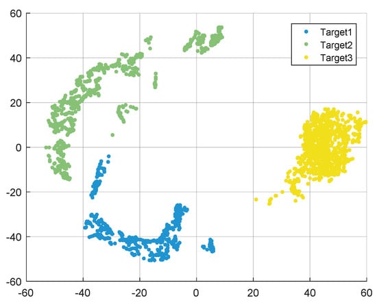 T-SNE is an effective high-dimensional data visualization algorithm. It can be utilized to intuitively obtain the distribution of UAV data points. In addition, it is also a data dimension reduction algorithm, which reduces the computational burden for subsequent classification work. The traditional t-SNE algorithm is inefficient in calculation. By adopting the Barnes–Hut algorithm, it is possible to quickly obtain data in 2D, 3D, and other multidimensional conditions. Visualization of data points of three types of UAV targets in two-dimensional coordinate systems is given in Figure 8. In Figure 8, a small number of data points of UAV1 are close to those of UAV3, which may cause difficulties in clustering. In this paper, we set the output dimension of each HRRP sample to be 5 after the t-SNE algorithm with Barnes–Hut processing.