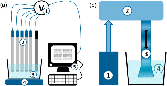 (a) Scheme of the potentiometric multisensor system. 1—multichannel digital mV-meter; 2—potentiometric sensors; 3—sample; 4—magnet stirrer; 5—PC. (b) Scheme of the UST device. 1—ultrasound generator; 2—magnetostrictive transducer; 3—waveguide; 4—sample [24] © 2019 by the authors.
