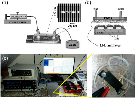 (a) Schematic of the system setup used in layer-by-layer (LbL) assembly; (b) cross-section view of the LbL film inside the microchannel; reprinted from [35] with permission from Elsevier (license 4684171385345); (c) photo of the microfluidic electronic tongue (ET) system [34] © 2017 by the authors.