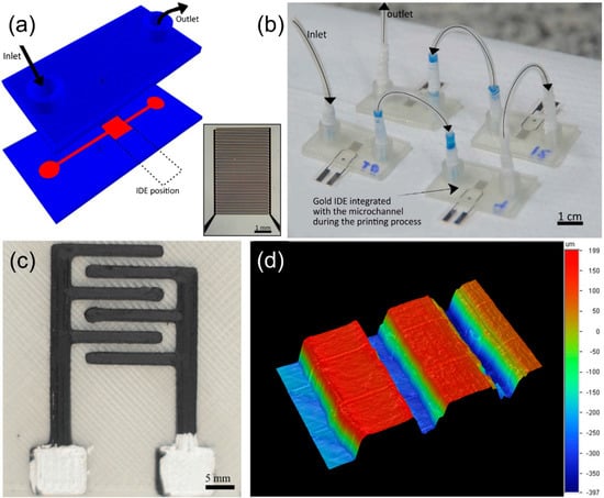 (a) Three-dimensional (3D) model of the electronic tongue sensor (the microchannel is in red). The interdigitated electrodes (IDEs) were manually inserted during the printing process; (b) photo of the microfluidic electronic tongue system ((a) and (b) reprinted from [37] with permission from Elsevier (license 4684171493577)); (c) 3D printed IDEs with three pairs of fingers 9 mm long, 1 mm wide, and intervals with 0.4 mm thickness; (d) 3D profilometry mapping of the printed IDE to estimate the root mean square (RMSS) surface roughness [38]. © 2018 Gaál, da Silva, Gaál, Hensel, Amaral, Rodrigues, and Riul.