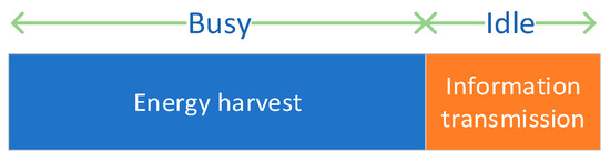 Let denote the leased spectrum of SU at time , for , where each SU controls its spectrum band from the PU. Let be the set of admissible spectrum band. The harvest-then-transmit mode in our proposed model includes two phases as shown in Figure 2, the energy-harvesting phase and the information transmission phase, respectively. In the energy-harvesting phase, the SUs will harvest enough energy for information transmission. In the information transmission phase, the SUs will use the harvested energy and leased spectrum to complete the information transmission tasks. Let denote the normalized channel idle period, and is the normalized channel busy period. When the channel is idle, is the time fraction of the SUs for information transmission. When the channel is busy, is the time fraction of the SUs for energy harvesting. The harvest energy during the period will be stored in the battery of the SUs for information transmission during the period. For example, the normalized idle period for the Disney TV channel is approximately 0.25 (25%), which means for the SUs in the Disney TV channel. Let denote the spectrum price of the PU when leasing the spectrum to SUs. The PU can adjust its price continuously as a seller during the idle period to maximize the spectrum income. The SUs should adjust the corresponding leased spectrum according to the needs and the spectrum price announced by the PU.