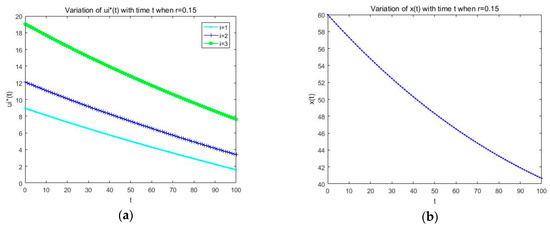 (a) Variation of with time t for the feedback solution; (b) variation of with time t for the feedback solution.