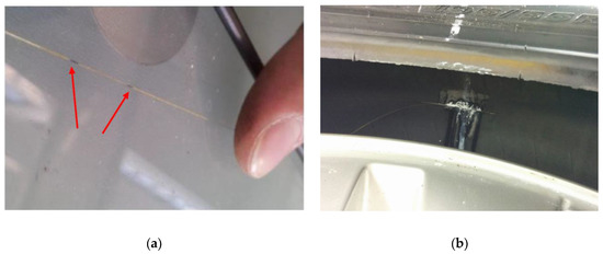 (a) The optical fibre with one fibre Bragg grating (FBG), the sensor lies within the black marks on the line; (b) the optical fibre pasted into the inner liner of the tyre; (c) the fibre exit connector from the rim.