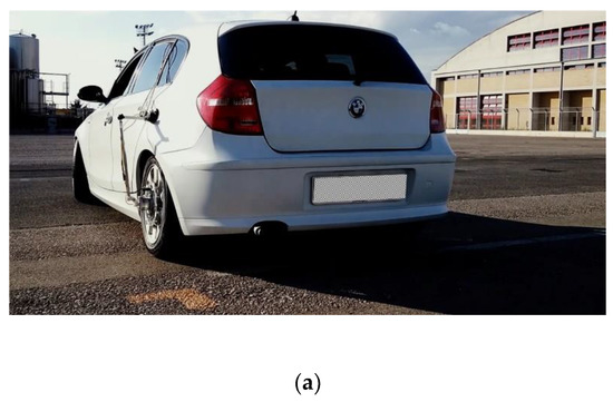 (a) The OPTYRE system mounted on the production car during the experimental campaign in operational condition; (b) a zoom of the measurement OPTYRE system in operational condition.