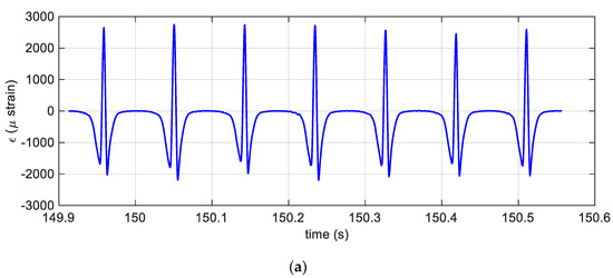 In Figure 8a, it is possible to notice a weak drift of the strain average. This was due to the fact that at the beginning of the acquisition the tyre was cold, but the hysteresis loss, produced by the cyclical deformation of the tyre, generated a temperature increment. This aspect was further justified by the linear relationship between temperature and tyre inflation pressure: at the beginning of the cycle, FBG sensors appeared at the unloaded position, diametrically opposite to the centre of the contact patch; instead, at late times, the position changed because of the circumferential strain of approximately 600 μstrain. In first approximation, this temperature gradient could be set as about 10 °C for a thermal expansion coefficient of a generic rubber.