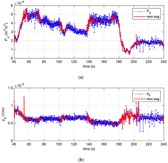 (a) The moving averages of the specific dissipated power evaluated in Figure 11a, sorted in ascending order in respect of the tyre velocity, along the x-axis; (b) the moving averages of the dissipation factor evaluated in Figure 11b, sorted in ascending order in respect of the tyre velocity, along the x-axis.