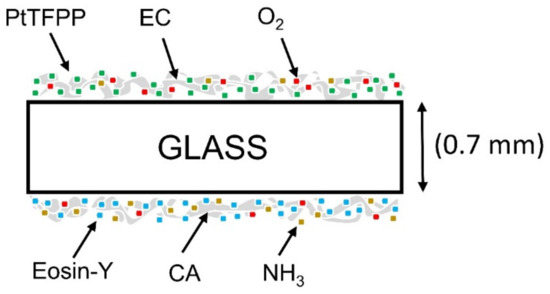 The oxygen-sensing material was spin coated (150 rpm for 20 sec) on one surface of a 0.7 mm glass substrate, and the ammonia-sensing material was spin coated (150 rpm for 20 sec) on the other surface of the glass substrate. The residual solvent in the sample was evaporated off at room temperature for 24 h to obtain the proposed dual gas sensor for O2 and NH3, as shown schematically in Figure 1.