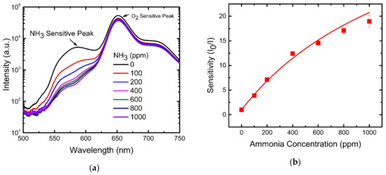 (a) O2-dependent emission spectra of optical dual sensor at 200 ppm NH3 concentration. Sensitivity plot at different oxygen concentrations for several fixed ammonia concentrations. (b) NH3-dependent emission spectra of optical dual sensor at 40% O2 concentration.