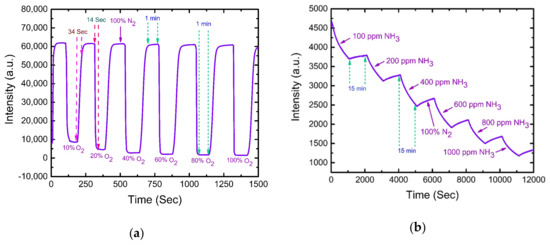 The rapid response of a sensor is necessary for practical applications. Figure 7a demonstrates the typical dynamic response of the optical dual sensor for O2 sensing while switching between 100% N2 to 100% O2 gases with gradual steps of increasing O2 concentrations. O2 gas was turned on for 1 min until the fluorescence intensity quenched to a saturated value, and then N2 gas was released to recover the fluorescence. The optical O2 sensor shows the response time of 14 s by switching from N2 to O2 and the recovery time of 34 s by switching from O2 to N2. Similarly, Figure 7b illustrates the dynamic response of the optical NH3 sensor. The concentration of NH3 gas was increased stepwise at every 15-min interval of the recovery of fluorescence intensity under 100% N2 atmosphere. The sensor exhibited a longer response (measured 22 min) and recovery time (hours) compared to the oxygen sensor. Fast recovery could be achieved by heating the NH3-sensitive material at 70 °C for 80 min. Thus, the proposed optical dual sensor provides a fast enough response for practical applications.