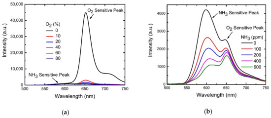 In most environmental and clinical situations, NH3 and O2 gases are present in a mixed form. Therefore, to estimate the concentration of individual gas components accurately, the dual sensor should not suffer from cross-sensitivity. To address the cross-sensitivity effect, we measured the spectral response of our proposed dual sensor at various mixtures of NH3 and O2 with different ratios. The spectral response (Figure 8a) of the dual sensor at different O2 concentrations in an ammonia environment fixed at 200 ppm is selectively sensitive to the O2 gas in the gas mixtures, i.e., the fluorescence of the ammonia-sensitive molecules is not affected with the change in O2 concentrations. On the other hand, the spectral response (Figure 8b) of the dual sensor at different NH3 concentrations in an environment of 40% O2 shows severe cross-sensitivity. It is obvious from the spectra that both the peaks that are individually responsible for NH3 and O2 sensing influence each other to some extent; in other words, we observe a spectral overlap or crosstalk in between the NH3 and O2-sensing signals.