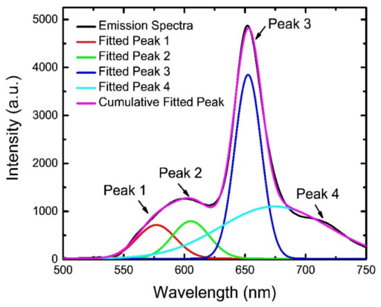 To resolve this issue and to extract the data with better accuracy, we fitted the spectra with a Gaussian profile and extracted the intensity of the individual peak, as depicted in Figure 9 for an example. Figure 9 shows an emission spectrum (black line) of the dual sensor in an environment of 10% O2 and 100 ppm NH3. A Gaussian fitting (pink line) of this spectrum generates four individual peaks (red, light green, blue, and light blue lines) after decomposition, wherefrom we could estimate the peak intensities at 582 nm (peak 1) and at 650 nm (peak 3) for NH3 and O2 sensing respectively without any ambiguity. This method was employed to all the spectra for estimation of the corresponding peak intensity.