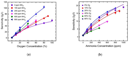 Finally, for practical applications, the calibration curves for a dual sensor influenced by the cross-sensitivity effect were plotted as presented in Figure 10. The figures reveal a negligible cross-sensitivity effect at lower O2 concentrations (below 20%) and NH3 concentrations (below 200 ppm), whereas they reveal non-negligible cross-sensitivity at higher concentrations of O2 and NH3 gases.