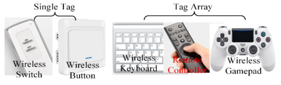 Since the state of the proposed tag can be distinguished by the chip code, which is hardly affected by surroundings, the proposed design can be used as a wireless and passive switch or control button for HMI in multiple scenarios. Moreover, arrays of the proposed tag with rational tag arrangements could contribute to a series of manual control devices for smart homes and industrial applications, such as wireless keyboards, remote controllers, and wireless gamepads, as shown in Figure 1. Compared to the traditional manual control devices, the proposed tag (or tag array) has a longer service time and lower cost, since it needs no batteries or electronic components (except the RFID chip). It is also more portable than the traditional manual control devices thanks to its compact size of 30 mm × 30 mm for every single tag, its light weight of only a few grams, and its flexible structure, which makes it easy to be rolled up after use. More importantly, unlike most traditional wireless manual control devices corresponding to only one transceiver (e.g., a wireless keyboard), a RFID reader could recognize lots of tag arrays, and a tag array can be identified by any authorized reader in an effective range at the same time.