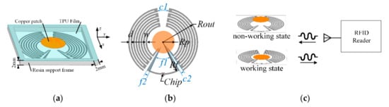 (a) Schematic with supporting frame and film; (b) geometry without supporting frame and film; (c) mechanism of the proposed radio frequency identification (RFID) tag.