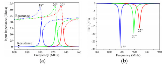 Figure 5 presents the variation of the input impedance and PRC depending on angle f1. f1 affected both the impedance of the matching stub and the current division factor. It showed a minor influence on the working frequency. However, a larger f1 lead to the increase of both the input resistance and reactance, and this increase became more significant in the higher frequency.