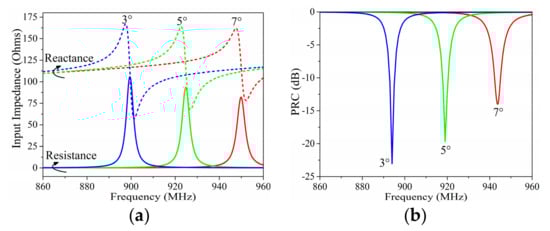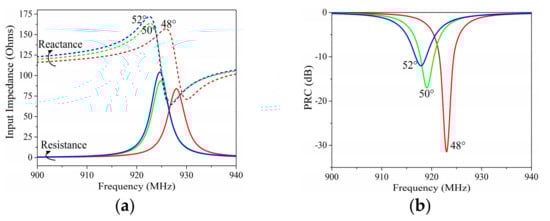 Figure 6 presents the variation of input impedance and PRC depending on length Rf. Rf affected both the dipole impedance and the current division factor in a different way from angle c2. The working frequency of the proposed tag moved to the lower frequency with the increase of Rf, and a faster movement appeared in the lower frequency. Meanwhile, the increase of Rf lead to a more significant increase of the input reactance.