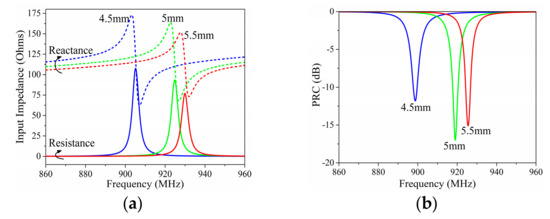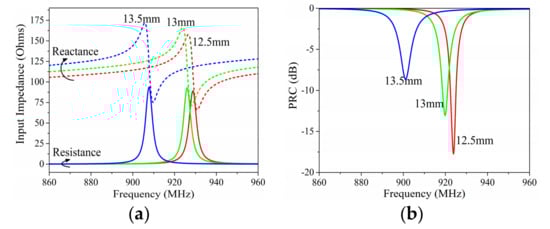 Figure 7 presents the variation of input impedance and PRC depending on length Rp. Rp affected the dipole impedance, the impedance of the matching stub, and the current division factor at the same time. The working frequency of the proposed tag moved to the lower frequency with the increase of Rp, and a faster movement appeared in the lower frequency. At the same time, the increase of Rp lead to significant increases of both the input resistance and reactance.