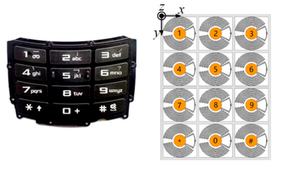 As a trial design, a simple array of the proposed tag is proposed and presented in Figure 9 by referring to a keypad arrangement. It consisted of 3 × 4 tags. Each tag in this array, which may represent a number, a letter, and/or a symbol, could be distinguished by its unique code contained in the response signal back to the reader when it was pressed. Commands and text input to the machine (including computers, phones, and other equipments) could be achieved by switching input methods.