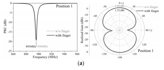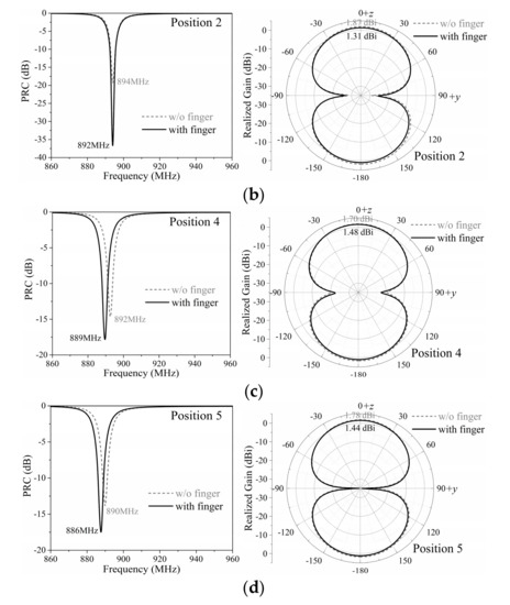 Figure 10 shows the simulation results of PRCs and radiation patterns of activated tags at different positions with and without the impact of the finger. Compared to a single tag, the working frequencies of tags in the array shifted to a lower frequency by about 30 MHz due to existence of adjacent elements. However, the activated tag at different positions had very close performances in both the working frequency and radiation pattern. The finger had a minor influence on the working frequency and realized gain of the tag, which can be attributed to the complex coupling conditions in the array. The center of working frequencies of the activated tag in the array remained between 886–896 MHz regardless of its position and the impact of the finger. The realized gains reduced from 1.8 dBi to about 1.4 dBi at their center frequencies when taking the impact of the finger into consideration; however, this reduction had a slight impact on the performance of the activated tag in the array.