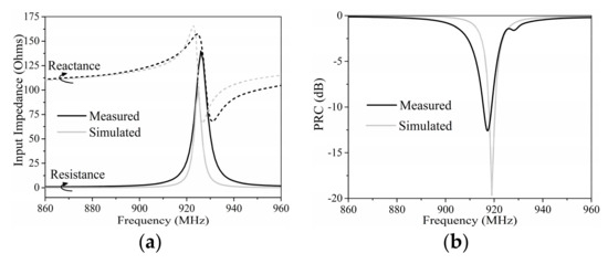 The comparison of simulated and measured impedance and PRC results of the proposed tag are shown in Figure 12. The deviation in the simulated and measured results was supposed to be caused by a manual operation error when applying the silver-epoxy adhesive and stick to the copper patch on the tag plane, and additional resistance was introduced by the silver-epoxy adhesive.