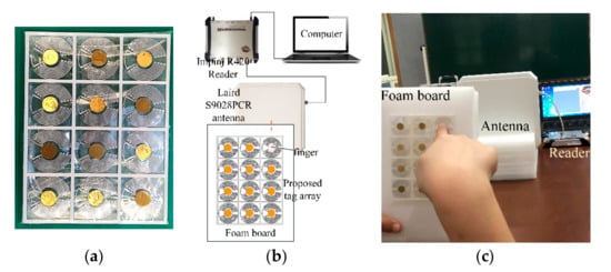 (a) Photographs of the finished prototype of the proposed tag array; (b) schematic and (c) photograph of the measurement of the proposed tag array.