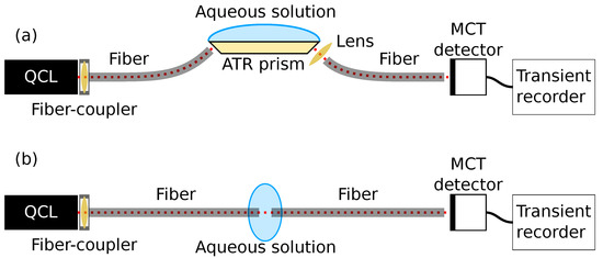 Overview of the two experimental setups, with sensing through (a) ATR spectroscopy and (b) transmission spectroscopy. For simplicity, the laser controller, the trigger line going from the laser controller to the transient recorder, and the control computer are not shown.