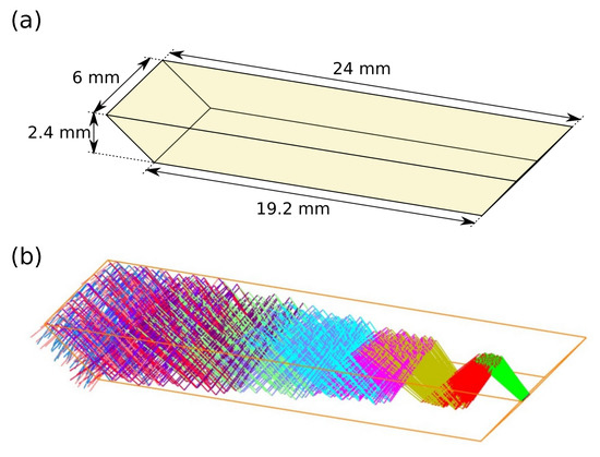 Propagation of light in the ZnS ATR prism was simulated in Zemax OpticStudio using ray tracing, see Figure 2. The radiation source was modelled as a beam with an initial diameter of 400 m, as this was the core size of the fiber. The divergence angle of this beam was set according to the numerical aperture (NA = 0.30) of the silver halide fiber. This created nine reflections in total as the beam propagated through the crystal, with five reflections on the top facet. The propagation length inside the prism is calculated to approximately 30.5 mm.
