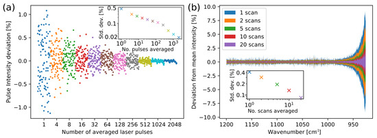(a) Characterisation of the pulse-to-pulse intensity variation from the laser with averaging over pulses at a single wavelength, where the inset shows how the relative standard deviation decreases with pulse averaging. (b) Characterisation of scan-to-scan variation with averaging over multiple scans, where the inset shows the average relative standard deviation using the 1200–1000 cm range.