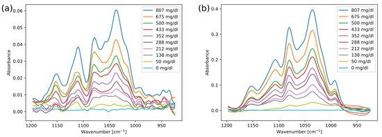 Ten glucose solutions were measured in the ATR and transmission configurations in order to characterise the setups. Typical spectra from these measurements are shown in Figure 4, after being subjected to a Savitzky–Golay filter (width 9). These measurements were also repeated within the same day and on separate days, for a total of four measurement series in each setup.