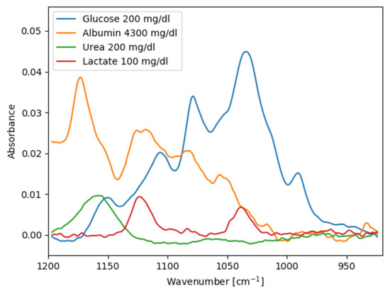 Figure 5 shows pure analyte spectra of the four species used in the samples, acquired in the transmission setup. Lactate has two absorption bands at 1040 cm and 1124 cm that overlap with glucose. Urea has only one small absorption band at approx. 1160 cm, but even this can interfere with glucose prediction depending on the latent variables found in the PLS model training. Albumin also has several absorption bands in the EC-QCL emission range. The concentration of albumin and other proteins is usually determined using the spectral region around 1600 cm, but it has been shown that the 1200–1000 cm range is sufficient to determine total protein and albumin content in human blood plasma [37,38].