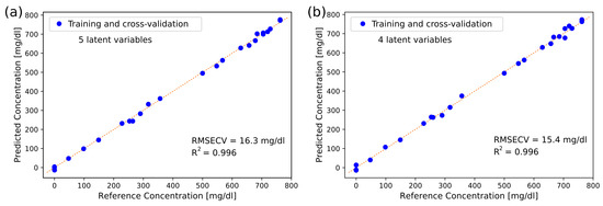 Figure 6 shows the predicted glucose concentrations for L5OCV plotted against the reference concentrations for the measurements in the ATR and transmission setups. Glucose prediction is linear over the entire range, also at low physiological concentrations (<100 mg/dL). This, together with the RMSECV levels, indicates that our findings are significant for physiologically relevant glucose concentrations.