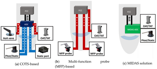 Possible certifiable architectural solutions are made up of certified probes, vanes, and air data units (ADUs) and/or ADC. The adjective certifiable refers to a system suitable for commercial flights, and not only for experimental purposes, according to applicable airworthiness regulations [22]. The Figure 1 shows schematically realistic solutions. A brief description of the three kinds of realistic architectures will be given in this section.