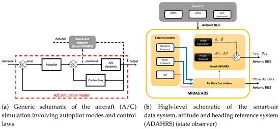 Previous research [32] showed that analytic evaluation is indeed feasible for the evaluation of AoA and AoS, thanks to on board available data and with dedicated virtual sensors, one trained ad hoc for AoA and another for AoS. With the present application, where aircraft complexity is higher (for the auotpilot and control law presence itself), the scenario changes. Even though the presence of autopilot modes and control laws, as well known, affect the A/C dynamic behavior, they do not influence generic state observers if they are fed with current output and control surfaces, as showed in Figure 3a.