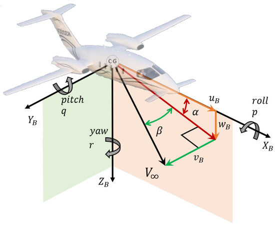 The present work is developed under regulations declared and published with the Grant Agreement number of Clean Sky 2. Data used in this paper are provided by Piaggio Aerospace and they are based on the SAT aircraft model inspired to the Piaggio P180 Avanti aircraft. Therefore, all data used to produce this work are property of Piaggio Aerospace. In favour of the reader, some public information are reported here about the reference aircraft in order to understand better the content of the present work. The reference aircraft has a canard-wing-tail configuration with two pushing propellers. Figure 4 shows the body reference system , the true airspeed vector, , positive directions of attitude angles (roll, pitch, yaw), body angular rates (p,q,r), body linear velocities (,,) and aerodynamic angles, AoA () and AoS ().