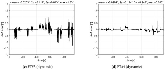 Figure 6 shows time histories of errors obtained with the VS-AoA on the four flight tests and corresponding error distribution. Results are within the required performance (Table 2).
