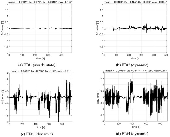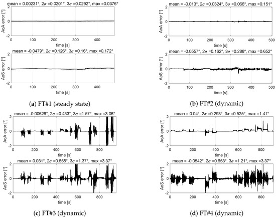 Figure 7 shows time histories of errors obtained with the VS-AoS on the four flight tests and corresponding error distribution. Even though errors of AoS estimation are larger than AoA, they are within the required performance (Table 2).