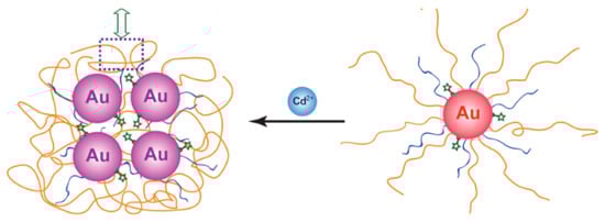 Mechanism of the cadmium(II)-induced aggregation of gold nanoparticles (AuNPs). Reprinted with permission from Reference []; Copyright 2011 American Chemical Society.