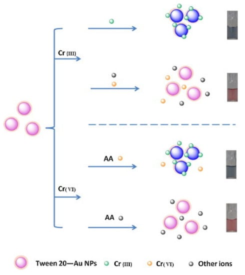 A colorimetric method based on citrate chelation on Tween-20-stabilized AuNPs for the detection of chromium(III) was developed by Wang et al. In this method, the Tween-20-stabilized AuNPs functionalized with citrate are dispersed in a phosphate buffer solution. Upon interaction with chromium(III), the AuNPs aggregate, causing a visual color change from red to blue. This method only induces the color change when exposed to chromium(III) and not chromium(VI) (Figure 2).