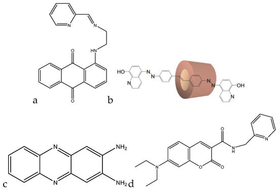 Structure of (a) the copper(II)-selective anthraquinone derivative, (b) rotaxane with 8-hydroxyquinoline as the blocking group (reprinted with permission from Reference []; Copyright 2010 Elsevier), (c) 2,3-diaminophenazine, and (d) coumarin-based fluorophore.