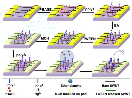 - Gong, J.; Sarkar, T.; Badhulika, S.; Mulchandani, A. Label-Free Chemiresistive Biosensor for Mercury (II) Based on Single-Walled Carbon Nanotubes and Structure-Switching DNA. Appl. Phys. Lett. 2013, 102, 013701. [Google Scholar] [CrossRef]