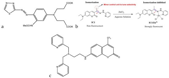 Park et al. developed a colorimetric detection method using a rotaxane dye (Figure 4b). The rotaxane coupled with the hydroxyquinoline allowed for a 43% enhancement in absorbance. At a pH of 7.5 in dimethylformanilide (DMF)/H2O (80:20, wt.%), the λmax shifted from 440 nm to 520 nm. The color change was also able to be detected down to 170 ppb, with the upper limit being dependent on the concentration of the dye. Since the color change was also ratiometric (similar to the previous chemosensor), a calibration curve can be formed with this dye as well, allowing for interpolation of concentration values in unknown samples [].
